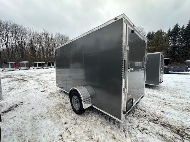 2026 POWER LINE CARGO 6X12 ENCLOSED V-NOSE TRAILER 2" BALL 4 WAY ELECTRICAL PLUG TUBULAR FRAME 16" O/C CROSS MEMBERS 16" O/C WALL STUDS 24" O/C ROOF CROSSMEMBERS 6'3 INTERIOR HEIGHT LED LIGHTS PLYWOOD INTERIOR SIDE BAR LOCK OVER DOOR 1 3500LBS EZ LUBE AXLE UPGRADES: HEAVY DUTY POLYCOR 4 RECESSED D-RINGS THE TRAILER FARM IS NOT RESPONSIBLE FOR ANY TYPOS OR MISPRINTS CASH OR CHECK $4095 THERE IS A 3% SURCHARGE FOR USE OF A DEBIT OR CREDIT CARD